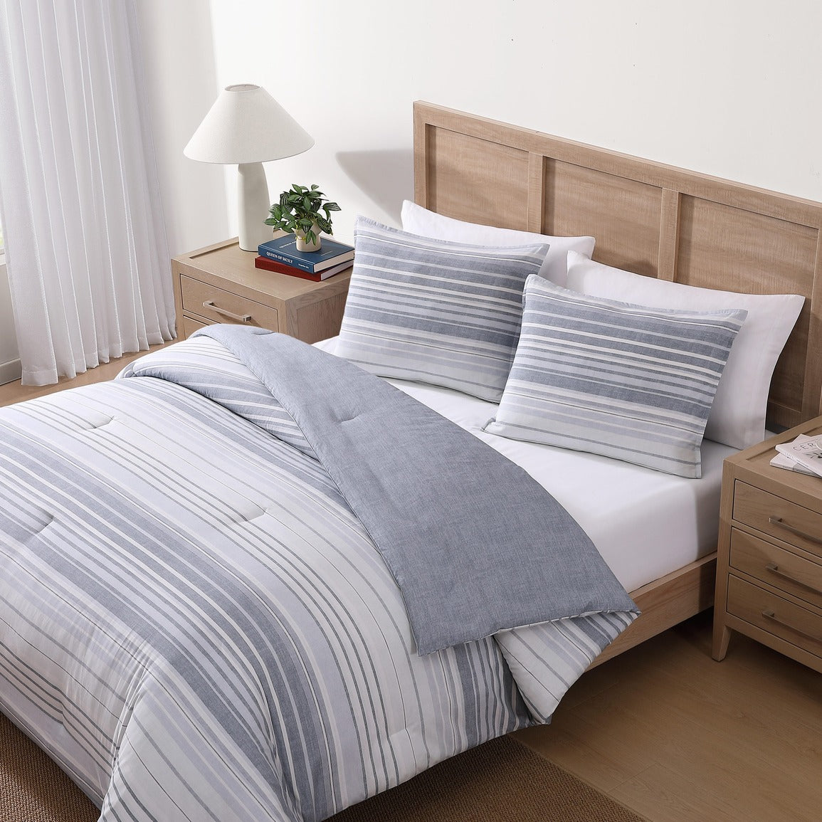 Elevate your bedroom with Tommy Hilfiger's Bold Stripe, offering a classic but bold pattern, this grey and blue design is sure to add signature style into your home; made from 100% cotton, this bedding offers a smooth feel while retaining the softness and breathability of cotton. Perfectly paired with Tommy Hilfiger's sheets and blankets for a seamless, layered look, this breathable, medium-weight cotton set provides comfort and style. This set includes a comforter and matching shams, and is machine washable for effortless care.