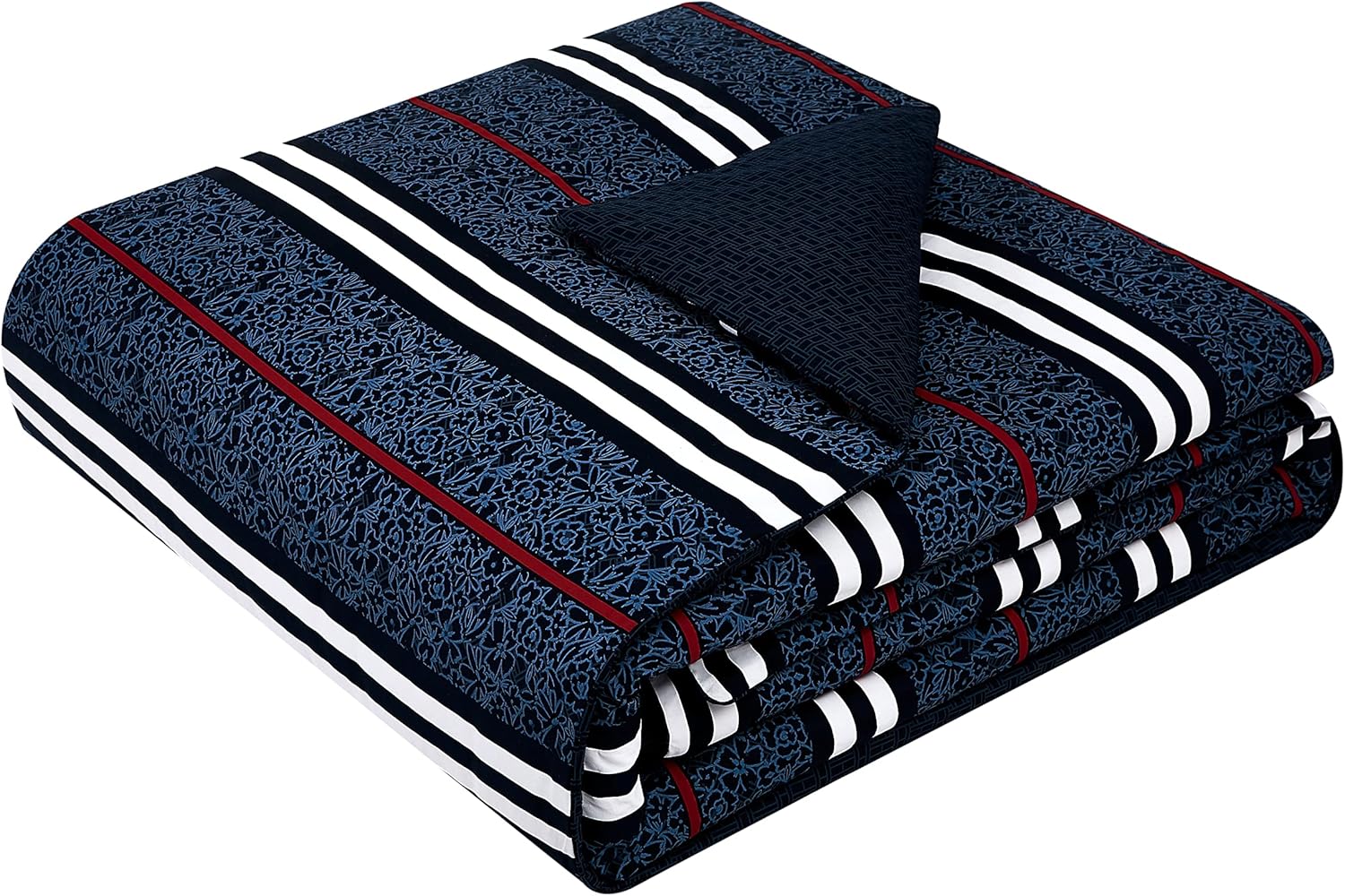 Contemporary or classic, Tommy Hilfiger's range of Comforter sets instantly transform your bedroom with a fresh new look. This set features a tropical print with stripe detail reversing to Tommy Hilfiger Monogram Interlock pattern in Navy Tommy Hilfiger Floral Stripe Sateen Comforter Set.